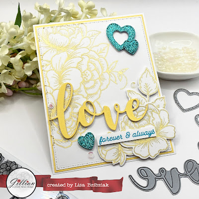 I die cut the Grande Love die from gold cardstock and twice more from white so I could stack them and then popped it up onto the card. I stamped a sentiment from the Valentine's Day stamp set in turquoise ink and cut it into a strip and added it to the card. Finally some turquoise glitter hearts and sequins to finish it off.